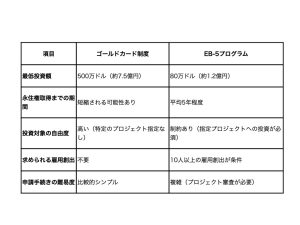 ゴールドカード制度と、これまで富裕層向けの移民プログラムとして知られてきたEB-5投資移民プログラムの主な違いは以下の通りです。
