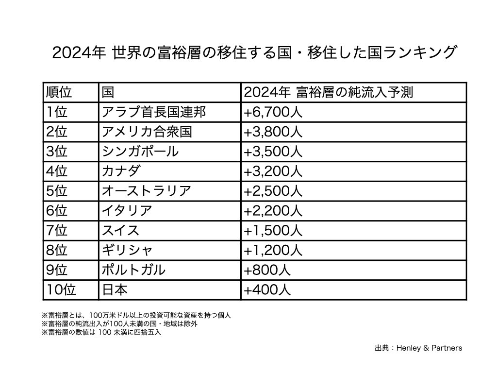 また、富裕層の海外移住先として、第1位のアラブ首長国連邦に大きな差が出ているものの、米国は第2位となっております。富裕層向けの税制面ではアラブ首長国連邦に及ばないものの、英語圏であること、過ごしやすい気候、民族の多様性、政治経済の安定性、世界主要都市へのアクセスのしやすさなどで、富裕層に大きな支持を得ています。